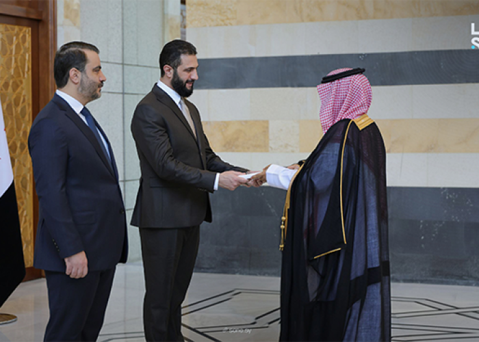 President Ahmad al-Sharaa received the credentials of the ambassadors of the Kingdom of Saudi Arabia, Ruben Kharazian, and the Italian Republic, to Syria, at the People's Palace on Monday.