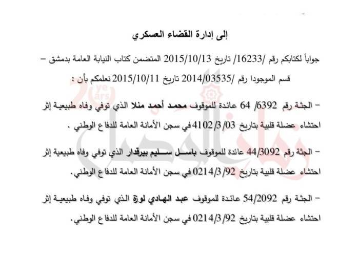 The documents, which consist of official correspondence from the Information Office of the General Secretariat of National Defense to the Military Justice Department in 2015, all share a similar conclusion regarding the fate of the detainees: "natural death due to myocardial infarction" (heart attack). This standardized diagnosis, applied to every case, contradicts numerous international human rights reports confirming that many detainees died as a result of systematic torture or the dire conditions in Syrian regime prisons.