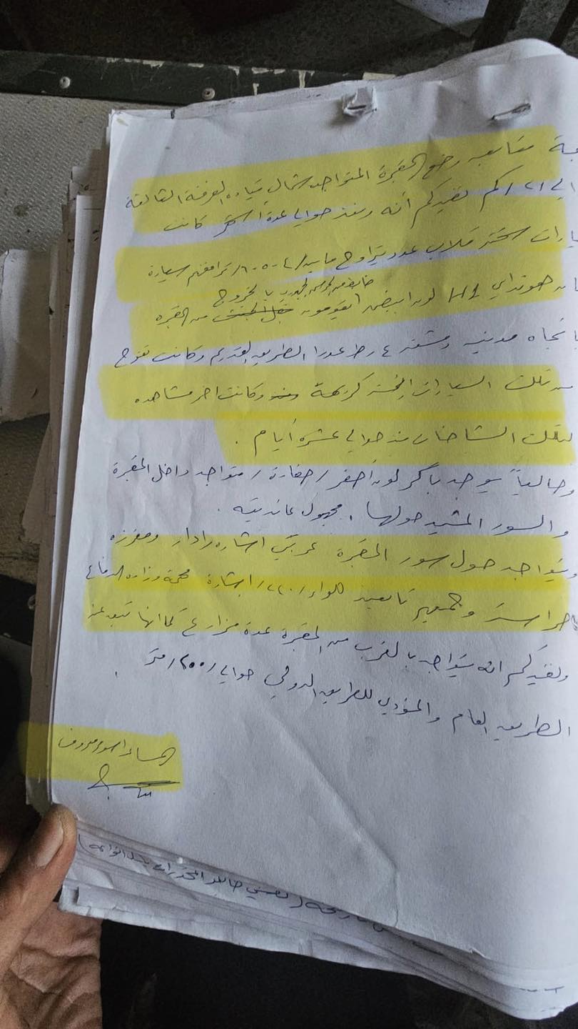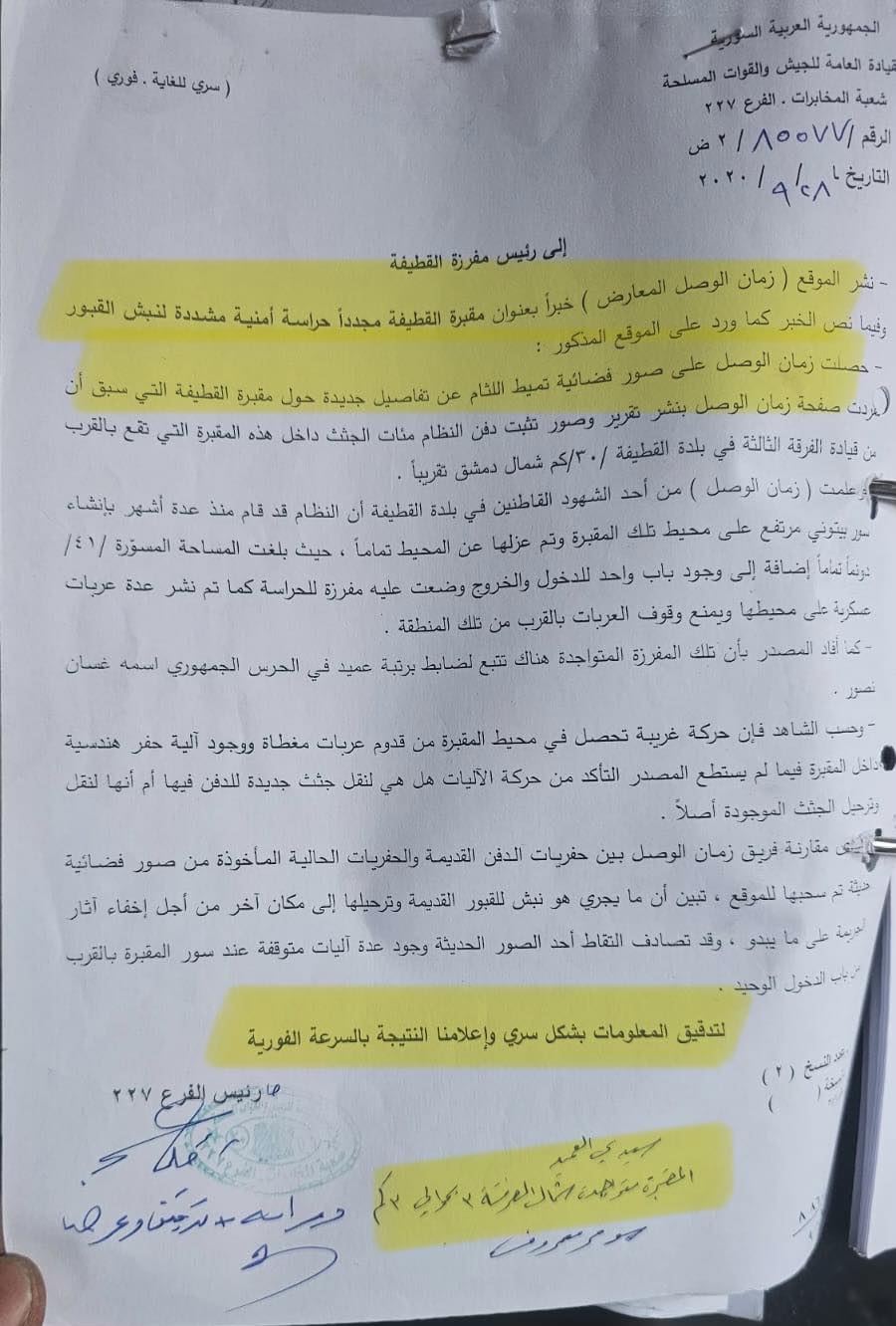 The document confirms that the Intelligence Directorate ordered the head of the Quatifa detachment to immediately investigate Zaman al-Wasl's report. This followed the newspaper's publication of satellite images showing the cemetery's expansion, the construction of a two-meter-high concrete wall, and its encirclement by heavy military guard. The investigation also noted a single entrance, the deployment of military vehicles, and a ban on approaching the area.