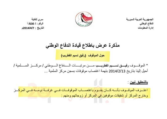 A leaked document, obtained by Zaman al-Wasl from a reliable source, issued by the National Defense Forces' "Information Department," proves the involvement of commander Rafiq Nassim al-Qatrib in the rape of female detainees and the extortion of their families, thus bolstering his ongoing trial in the Netherlands on charges of war crimes.