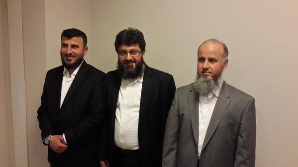 Jaysh al-Islam commander, Zahran Alloush, accompanied by commander of Ahrar al-Sham Movement, Hashim al-Sheikh (Abu Jaber), and Suqour al-Sham's leader Abu Issa al-Sheikh, All, have appeared clean, wearing suits and posing to the camera with a smile reflects the spirit of the victor.