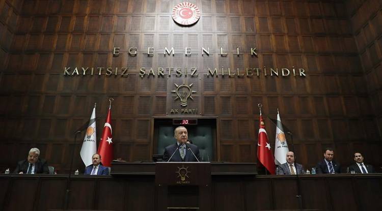 Turkish President Recep Tayyip Erdogan addresses Tuesday lawmakers of his Justice and Development (AK) Party at parliament. He says Turkey has dealt a heavy blow to the terrorist YPG/PKK organization in Afrin, Syria, adding that the country will soon move to eliminate terrorist groups east...