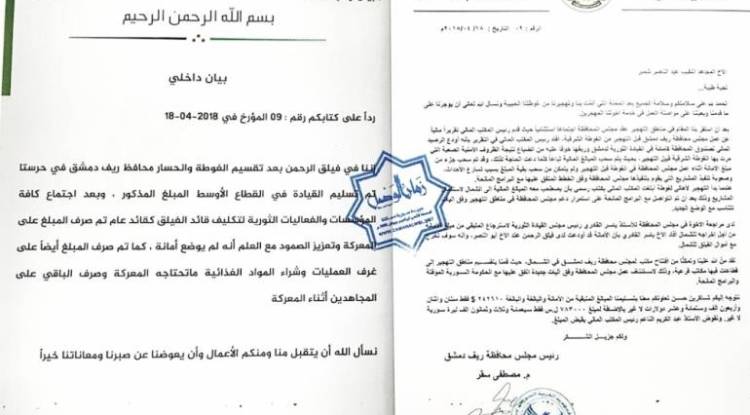 (Zaman Al Wasl)- Faylaq al-Rahman, once key Islamist group in Eastern Ghouta suburbs, has swindled the local council, taking $250,000 before being evacuated to northern Syria, documents obtained by Zaman al-Wasl showed. Mustafa Saker, Head of the Local Council, demanded the group to...