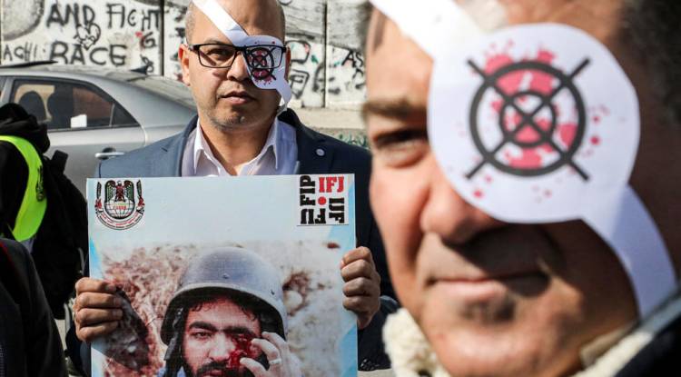 "The eyes of truth will never be blinded," protesters' placards read, as Palestinian journalists wore eye patches Sunday to decry the wounding of a colleague in the occupied West Bank. Muath Amarneh has been in an Israeli hospital since he was hit in the eye Friday during clashes between...